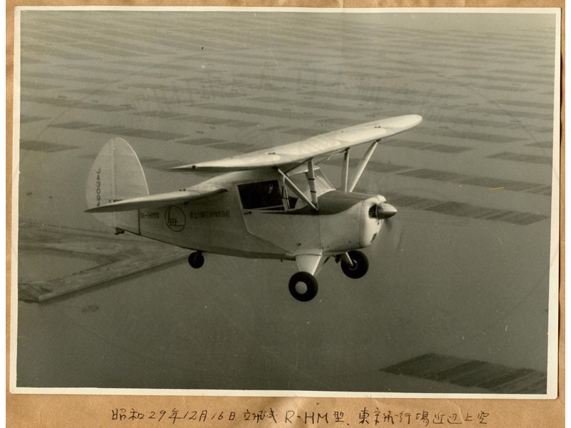 R−HMは「空飛ぶ自家用車」を目指した2人乗り(並列復座)の軽飛行機でした(1954年10月20日初飛行)。独特な操縦方法のために耐空証明を取得できませんでしたが、ユニークなスタイルで注目を集めました。2021年現在は、立川市の「TAKEOFF−SITE」に展示されています。