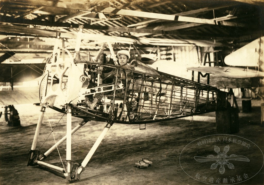 甲式三型(ニューポール24)練習機の胴体が、外布を剥がした状態で置かれています。男が下駄を脱いで操縦席に座っています。後ろには別の機体、中島五型J-TEIMも置かれています。1925年頃、民間の飛行機整備工場でオーバーホール中に撮影された写真と考えられます。甲式三型(ニューポール24)は、1917年から陸軍で使用され、その後払い下げ等で民間でも多く使われた飛行機です。羽布が剥がされた状態のため登録記号や所属は不明ですが、内部構造が分かる写真となっています。