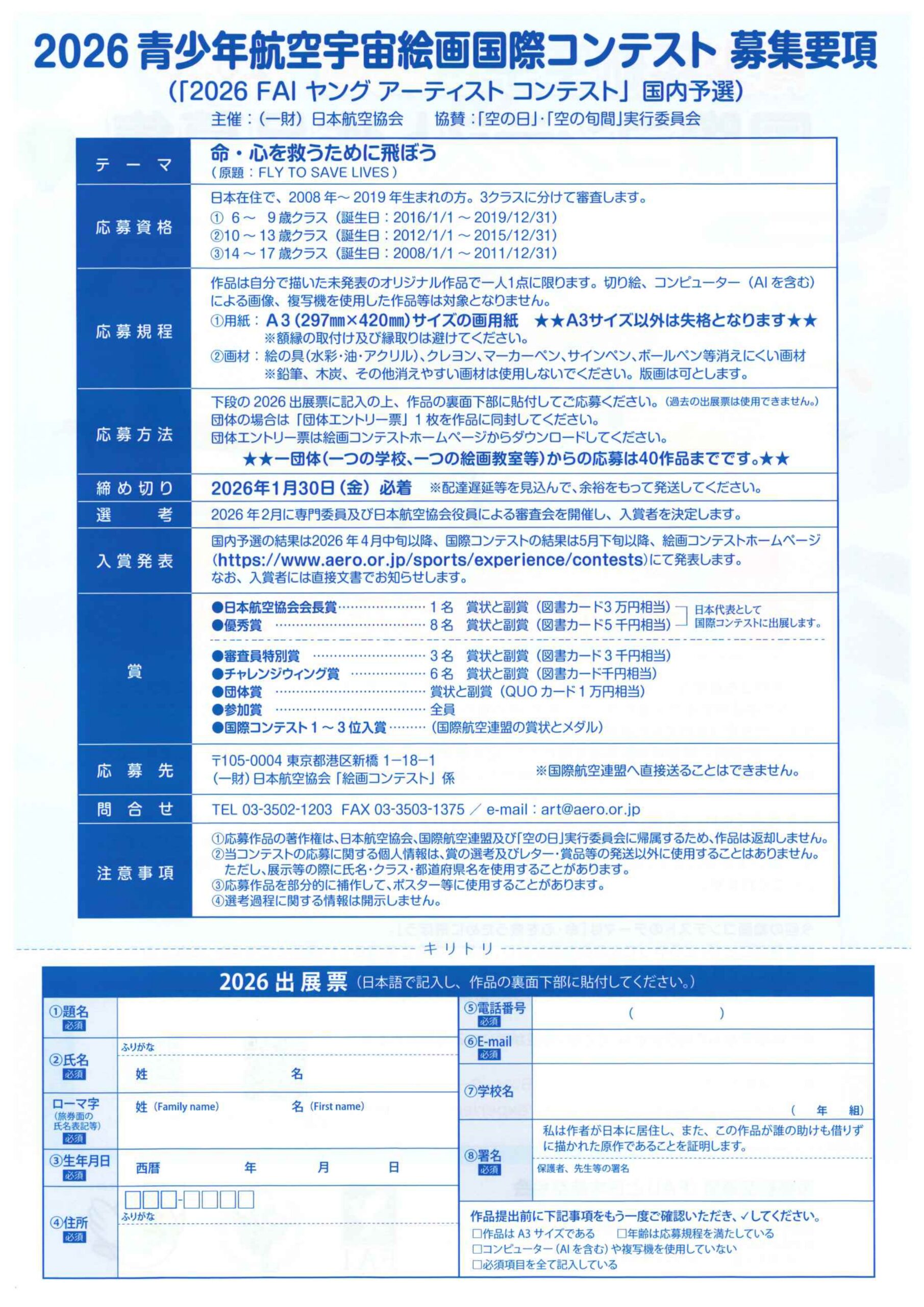 (一財)日本航空協会「絵画コンテスト」係※国際航空連盟へ直接送ることはできません。