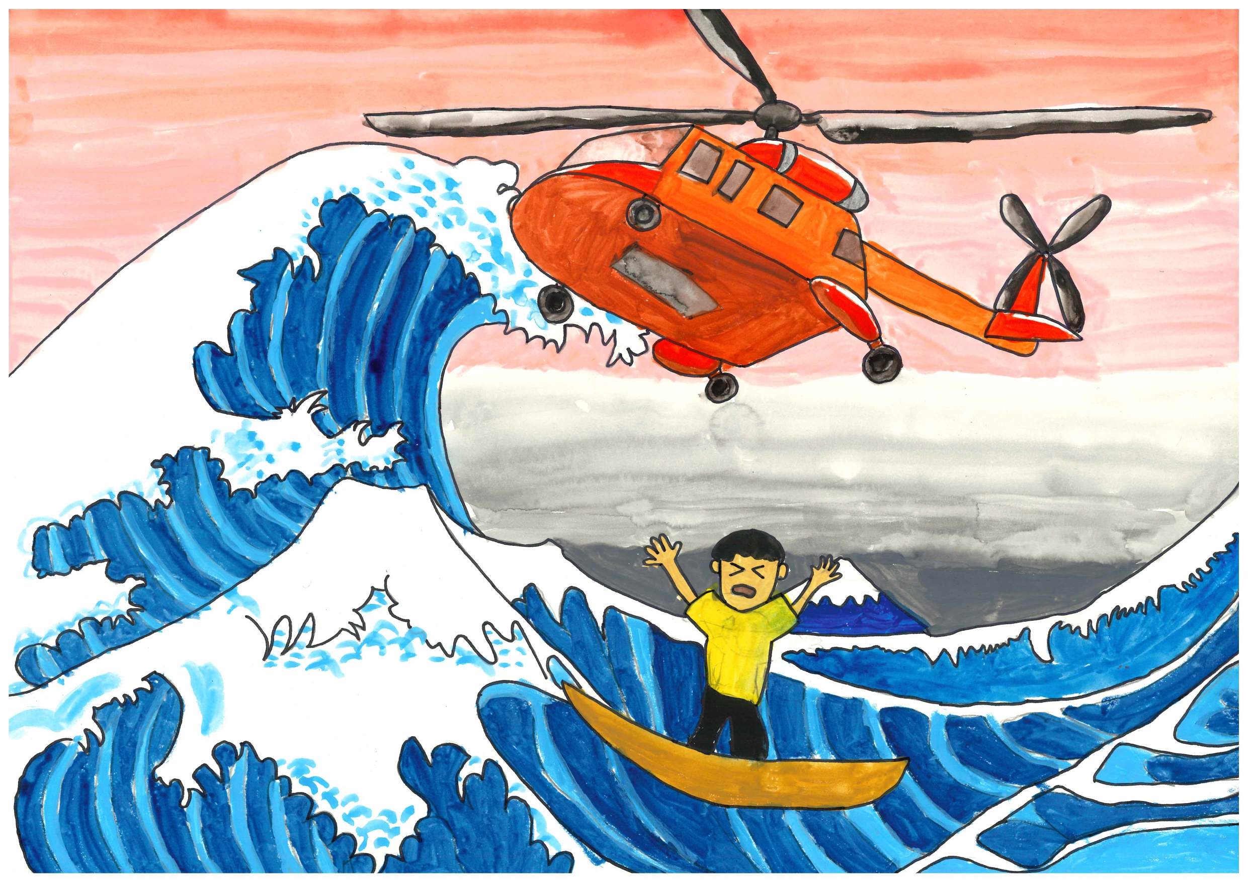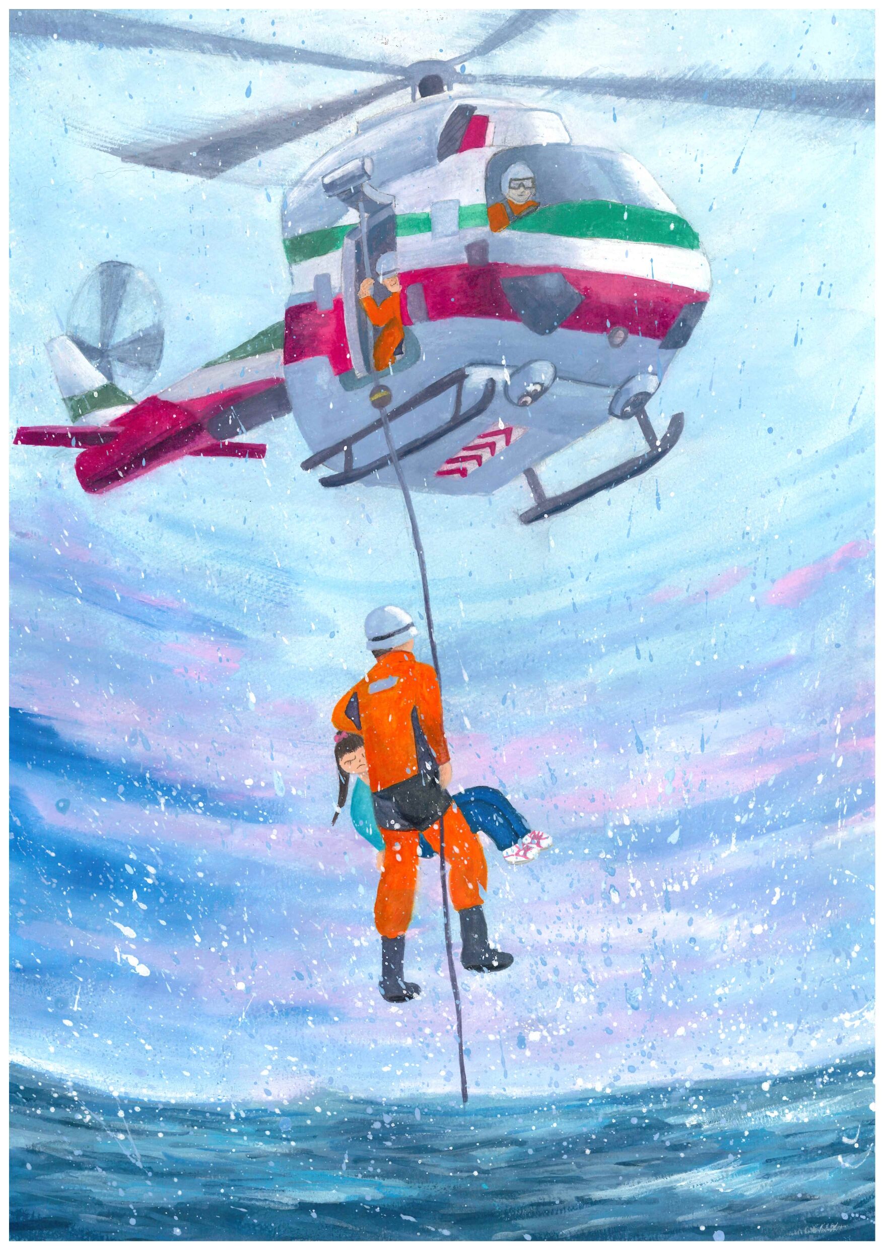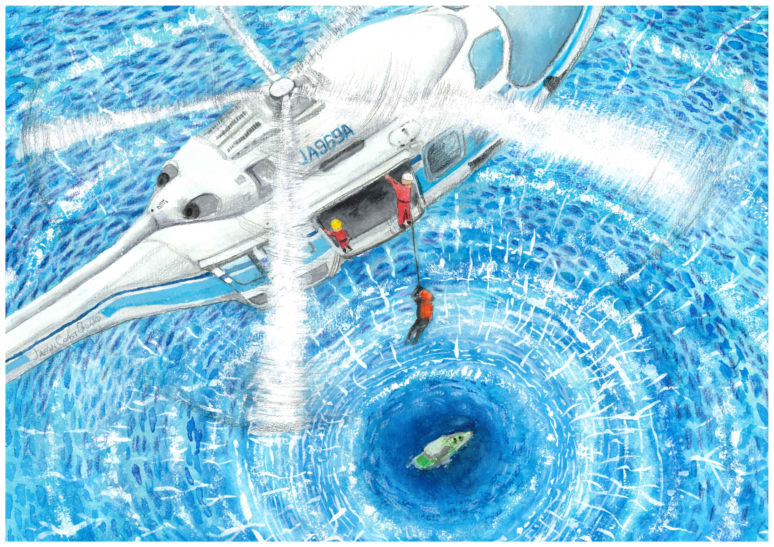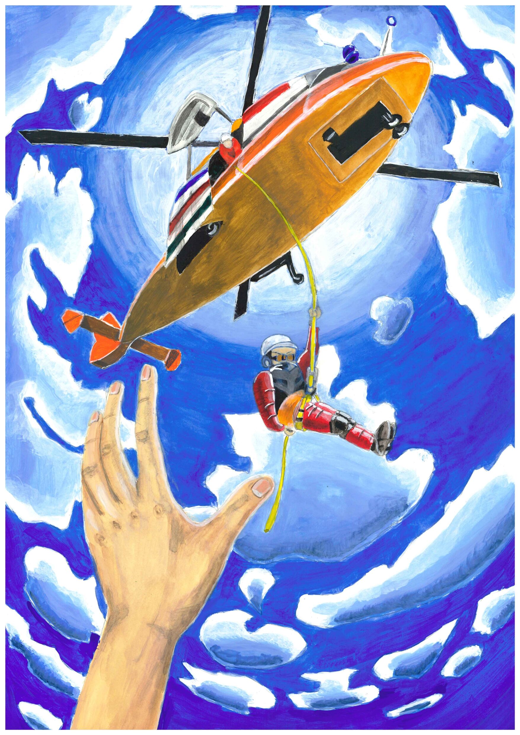 - ・空をバックにヘリを直下から描き要救助者の手のみを描く、とても上手に構成された絵です。