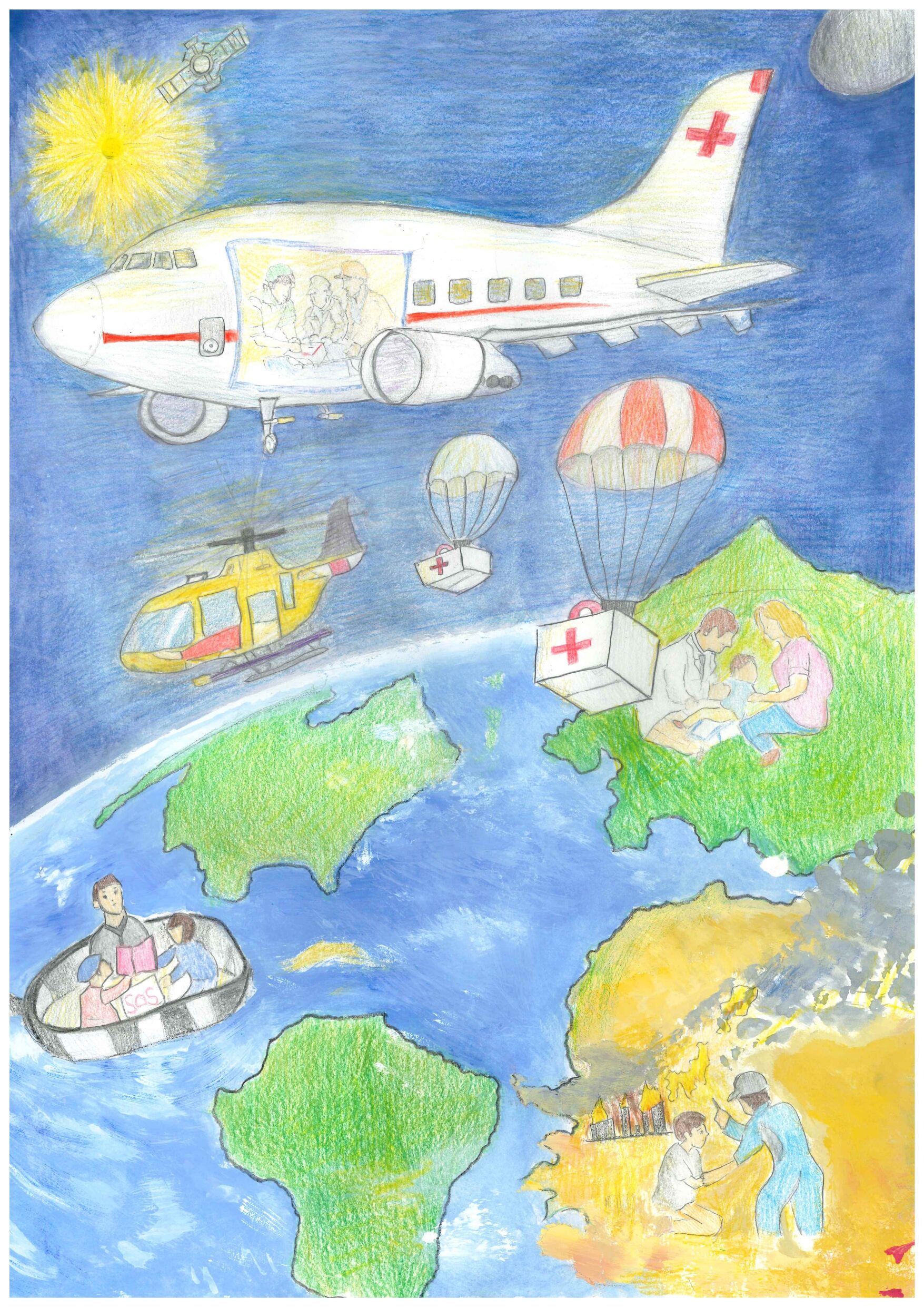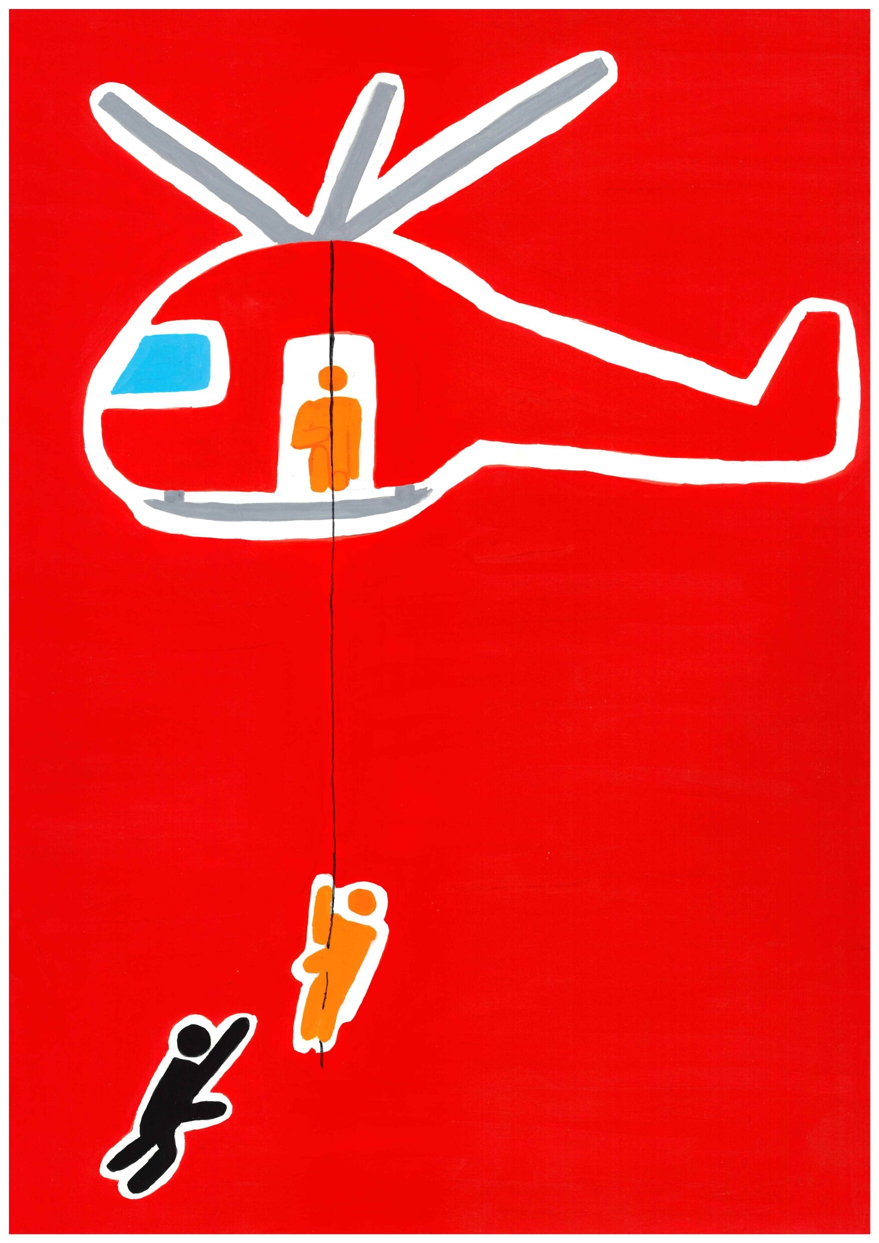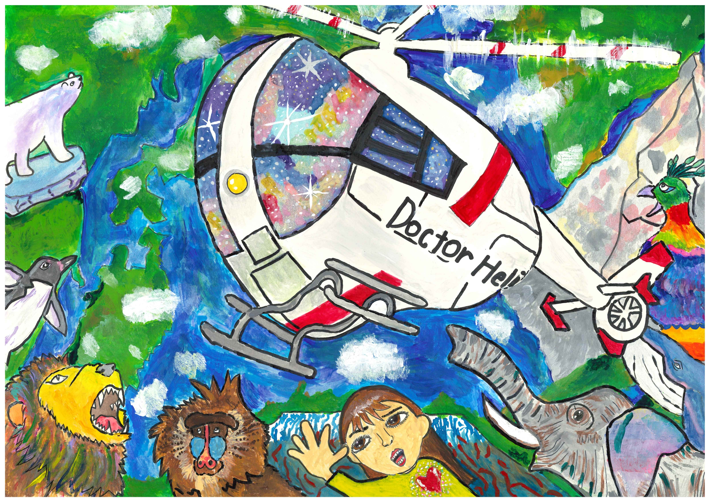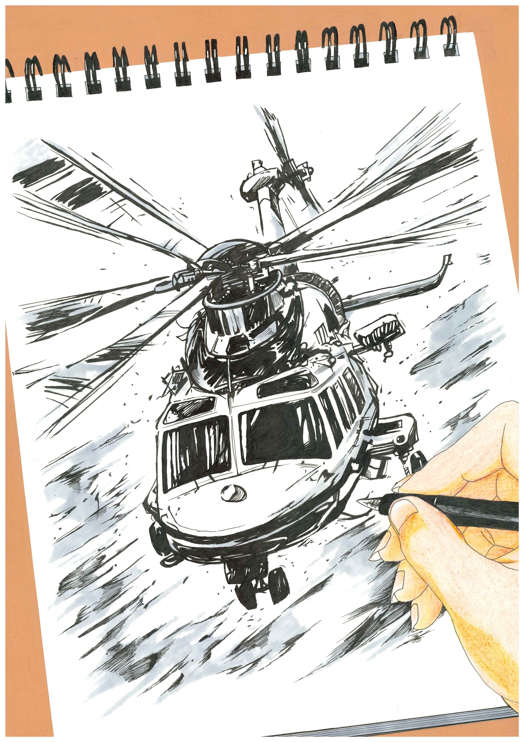- ・空をバックにヘリを直下から描き要救助者の手のみを描く、とても上手に構成された絵です。