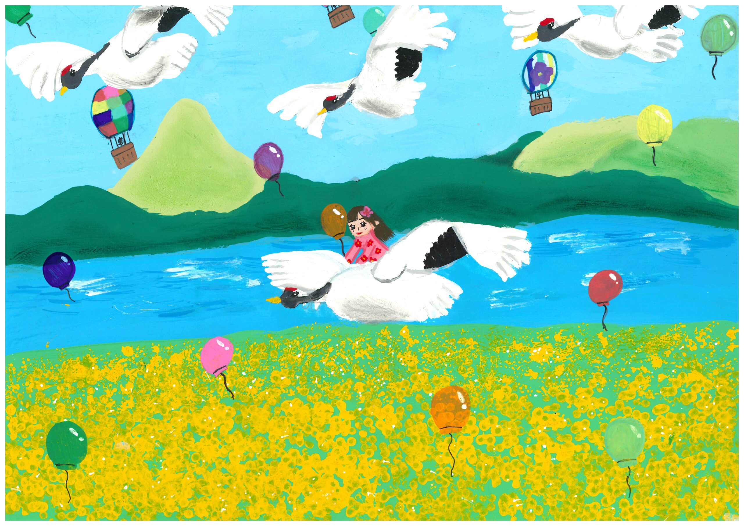 - ・鳥に乗って空の旅 気球や風船が楽しそうです。菜の花畑の描き方がとても上手です。鉛筆のスタンピングでしょうか。