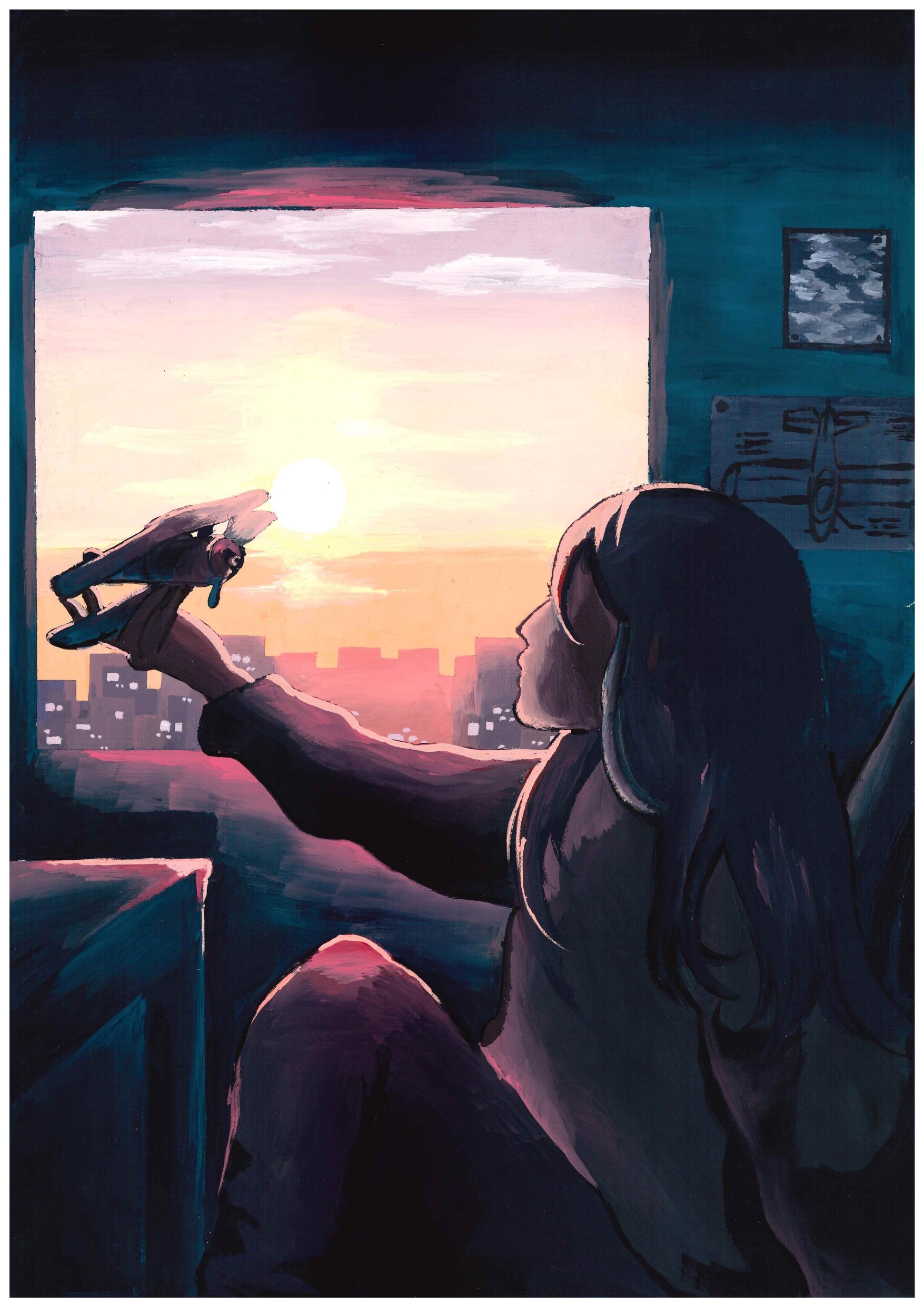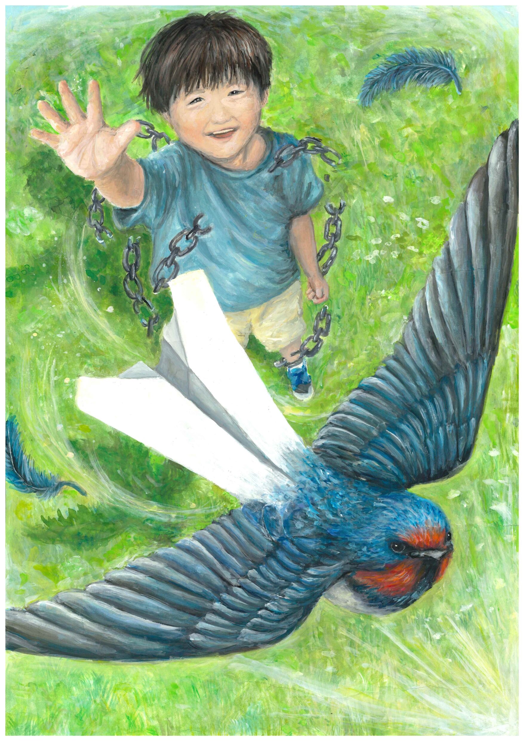 - ・この少年は紙飛行機を飛ばすことにより何かから解放されたのでしょう。鳥の羽が画面の外まで描いてあるのも良いです。