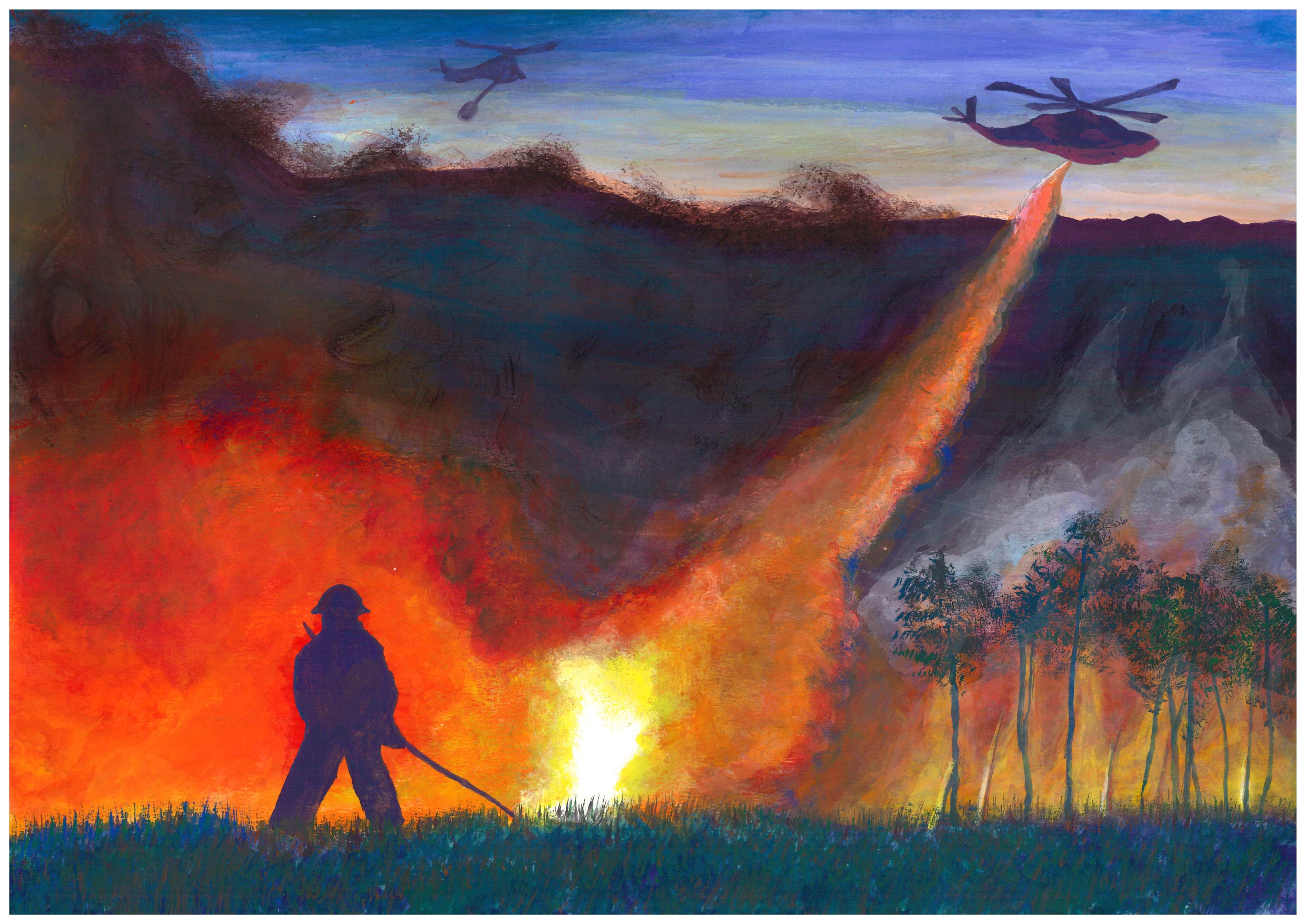 - ・同じ夕日の逆光なのですがこちらは報道写真を感じます。消火剤を撒くヘリも良く描けています。
