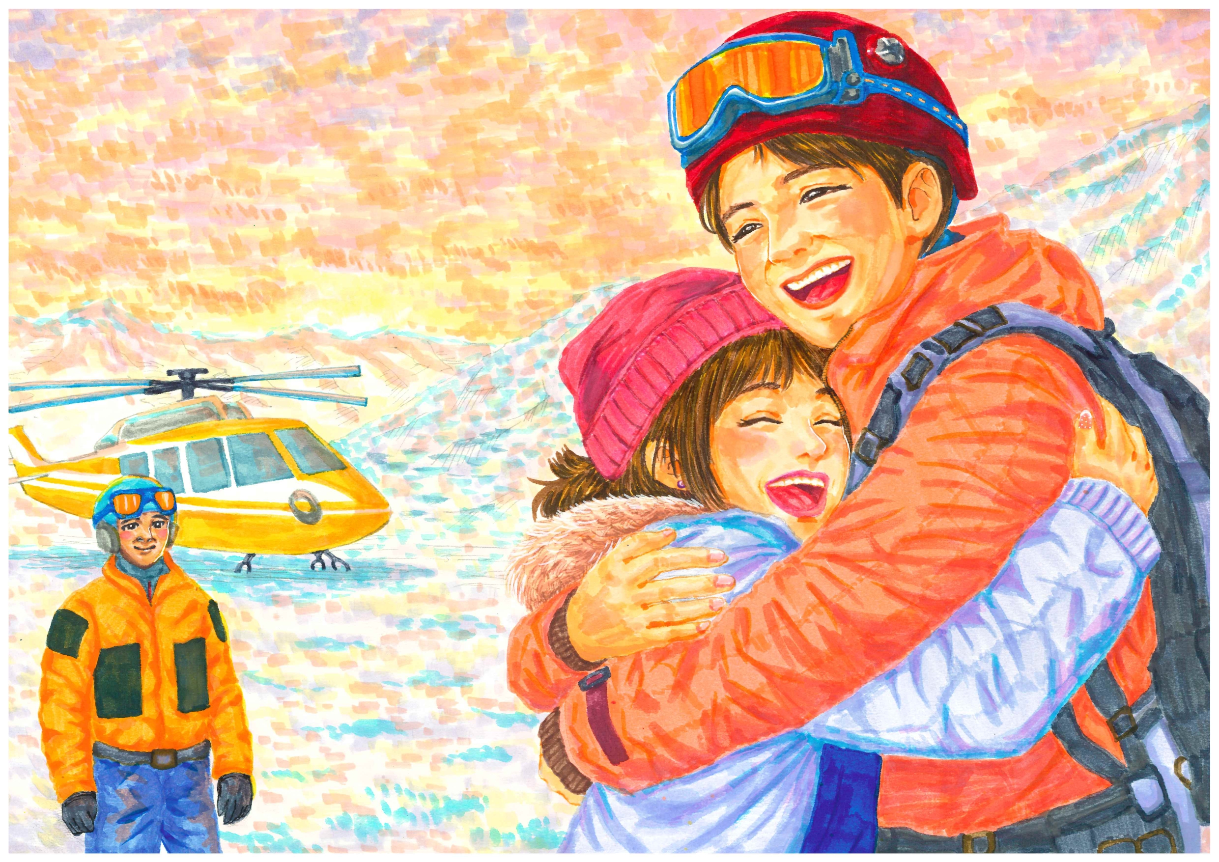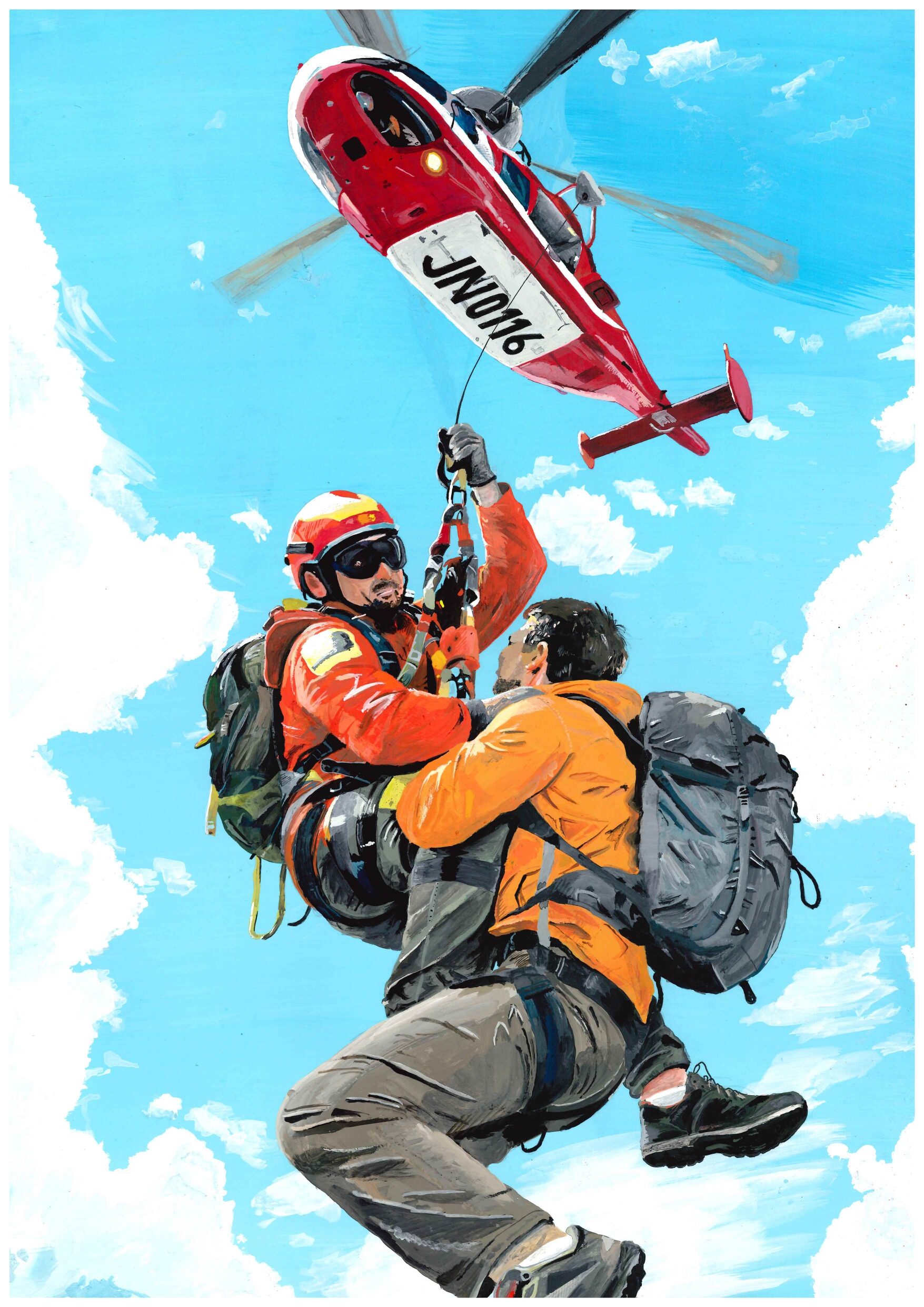- ・ヘリコプターの安定感と救護員にしっかり抱かれて吊り上げられる安心感がよく描けています。