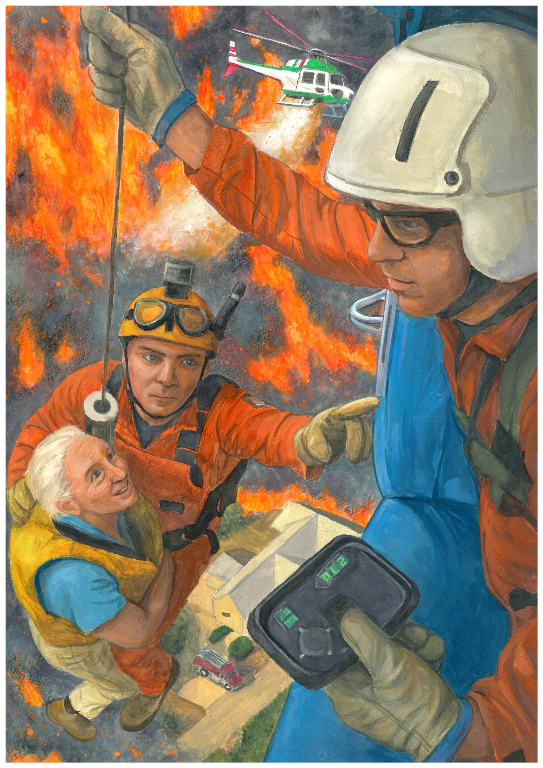 - ・海や山砂漠の事件に空から駆けつける救助隊の絵ですね。宇宙からのGPSが現代的です。